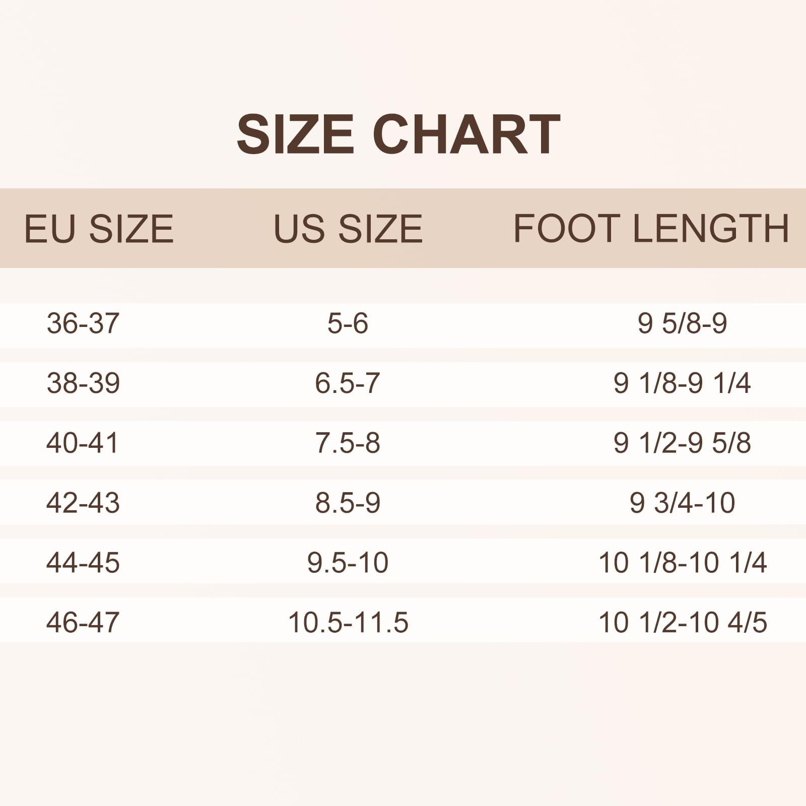 6 sizes: 5-6, 6.5-7, 7.5-8, 8.5-9, 9.5-10 and 10.5-11.5.
